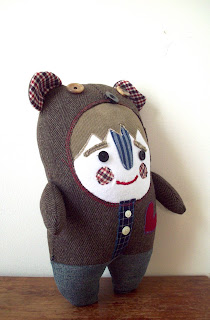 Here is the third doll from the Alex Project. I like this one a lot. His bear suit is made out of Alex's coat, he has corduroy hair, a t-shirt face and a t-shirt heart. His legs are made out of a well-worn pair of jeans. I have three more to make. One will be a super-hero, one a pirate and the other I am not quite sure yet.